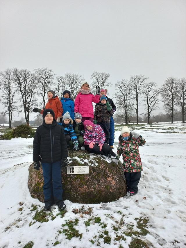 Vaatasime Tamsalu jalakäijate tunnelis uhkeid seinamaalinguid, mis sündisid eelmise aasta suvel Tapa muusika- ja kunstikooli ning Eesti Raudtee koostööleppel. Tunneli seintele on maalitud näiteks Villu Tamme ja ka mitu kohalikku elanikku. Iga õpilane valis välja oma lemmikpildi. Tuletasime meelde Eesti rahvuskivi ja puu. Lugesime 100 tamme pargis vanasõnu ning tutvusime paekivi väljapanekuga Kukelossis.