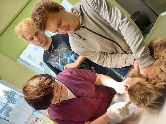 Võtsime kass Willemi kaasa ja suundusime kokkulepitud ajaks V-Maarja Loomakliinikusse. 54 aastat veterinaarina töötanud Maia õmbles parasjagu ühe kiisu klaasikilluhaava. Tema poeg Hannes valmistus eakal koerapoisil kasvaja eemaldamise operatsiooniks. Meie Willemil leiti puuk, tehti vaktsiinisüst ja kõhuusside peletamiseks anti tabletti.