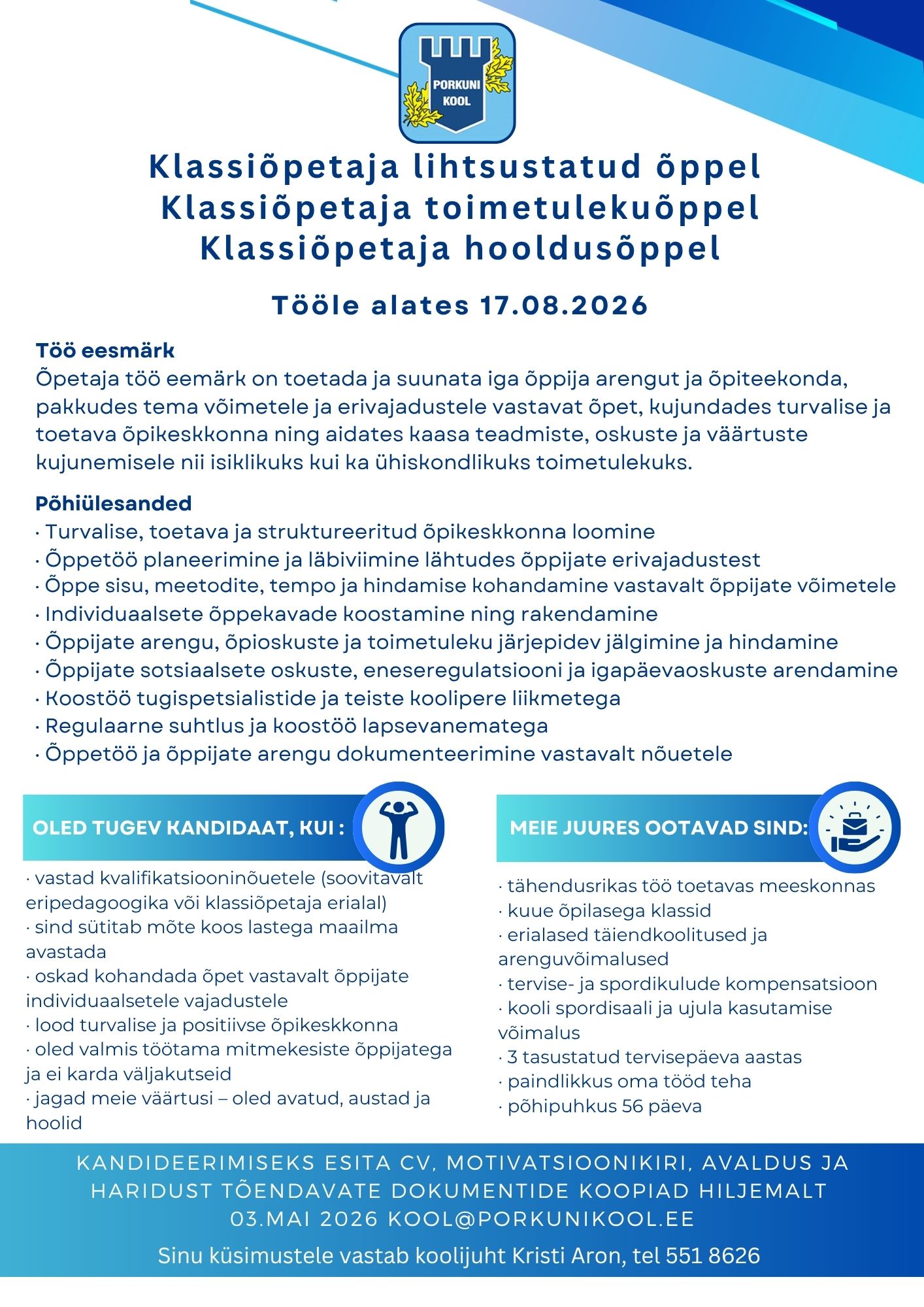 Tööpakkumise 2026/27 õppeaastaks klassiõpetaja või eripedagoogi ametikohale. Ava kuuluused!
